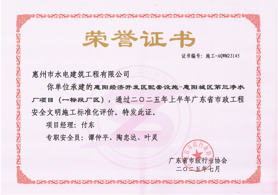 近日,廣東省市政行業協會傳來喜訊,由我司承建的惠陽經濟開發(fā)區配套設施—惠陽城區第三凈水廠項目(一標段廠區),順利通過2025年上半年“廣東省市政工程安全文明施工標準化”評價。……